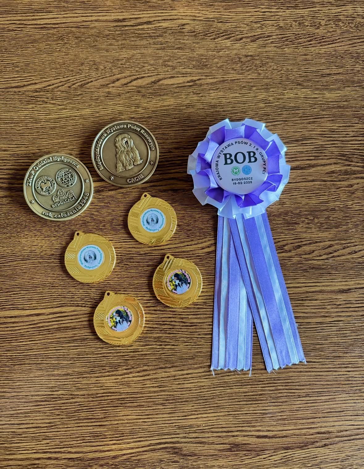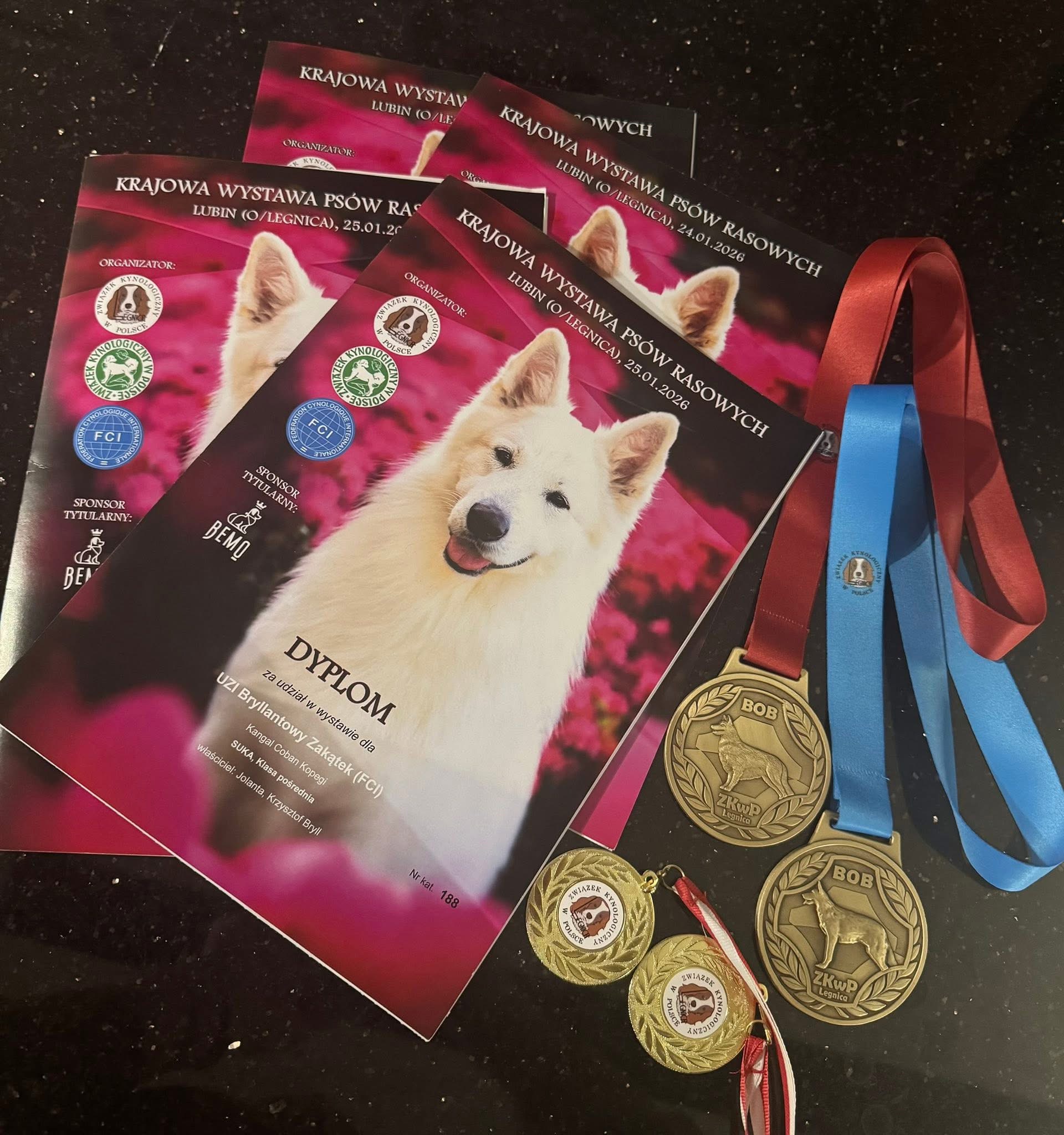 Pies uzyskał ocenę doskonałą, miejsce 1 oraz następujące certyfikaty: CWC/CAC, RES.CACIB